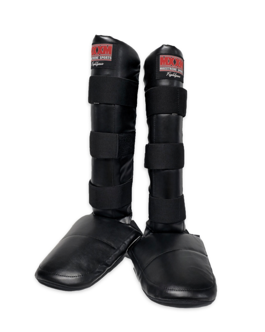 Maxxtreme S25 PU scheenbeschermers kunstleer. Deze Maxxtreme scheenbeschermers beschermen je schenen en voeten tijdens je training. Het zijn voorgevormde scheenbeschermers die goed aansluiten en de 3 straps bij de kuiten, 1 lus bij de hak en onder de voet zorgen ervoor dat ze niet verschuiven tijdens de training.